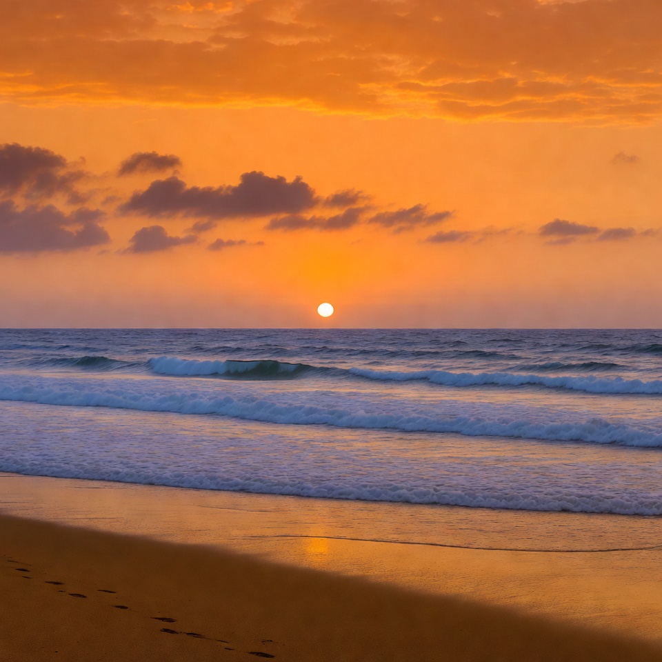 A vibrant orange sunset illuminates the sky above a sandy beach with gentle ocean waves crashing on the shore. Footprints trail across the golden sand in the foreground. The sun hovers low over the horizon, casting warm reflections on the water.