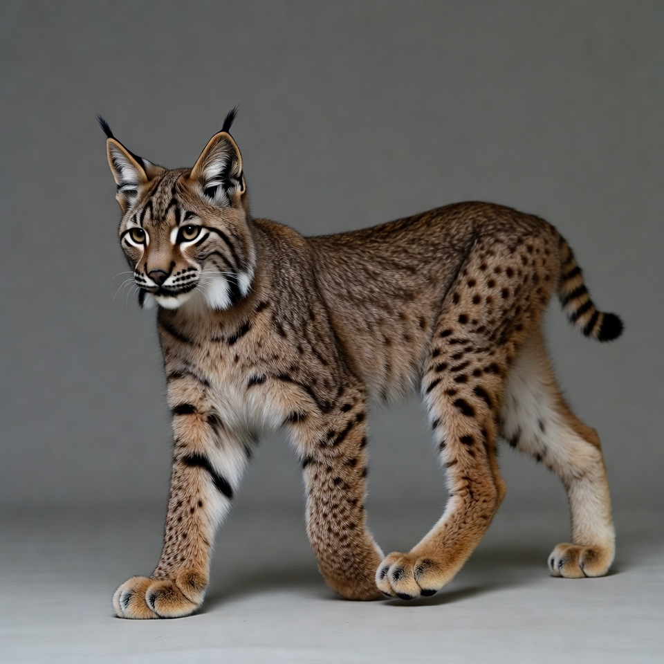 A lynx with tufted ears and spotted fur walks forward against a plain gray background. Its yellow eyes gaze ahead, and its paws are visible in motion. The wild cat has a fluffy tail and striped legs.