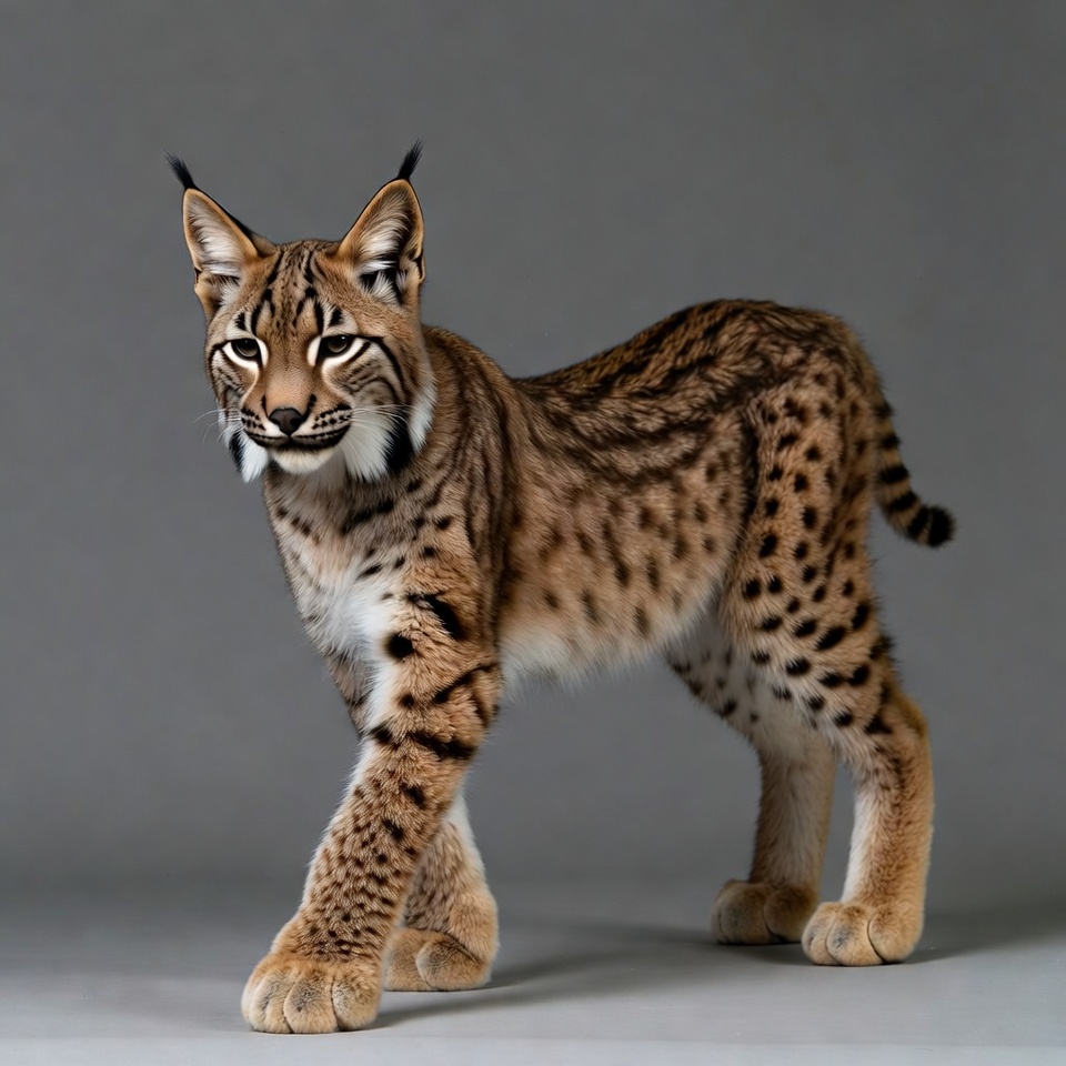 A lynx with spotted fur and tufted ears walks forward against a plain gray background. Its muscular body is covered in tawny fur with black spots, and its large paws are visible. The cat's yellow eyes gaze ahead with a slight smile on its face.