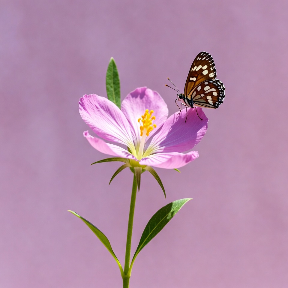 bloom, flower stem, green leaves, insect, isolated background, macro, nature, petals, pink flower, purple background, spotted butterfly, wings, yellow stamens, butterfly