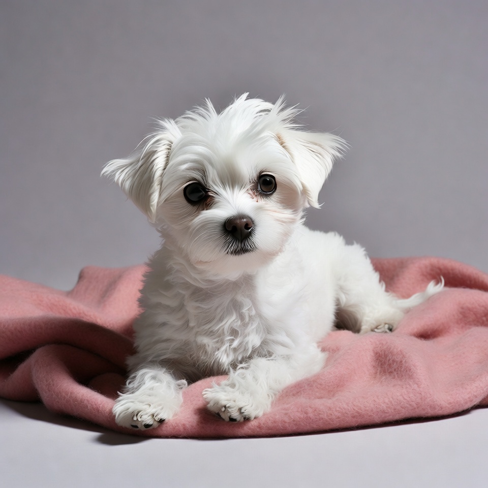 White Maltese puppy on pink blanket