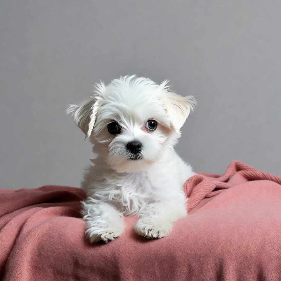 Maltese puppy, animal, curly fur, cute puppy, dog, dog eyes, fluffy dog, isolated background, pet, pink blanket, sitting dog, small dog, white puppy, puppy