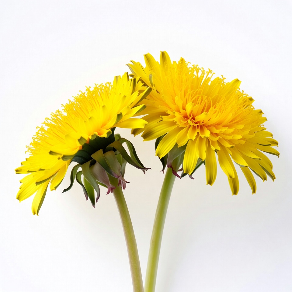 bloom, botany, dandelions, floral, flower, flowers, fluffy petals, green stem, isolated, nature, two dandelions, white background, yellow dandelion, yellow flower, dandelion