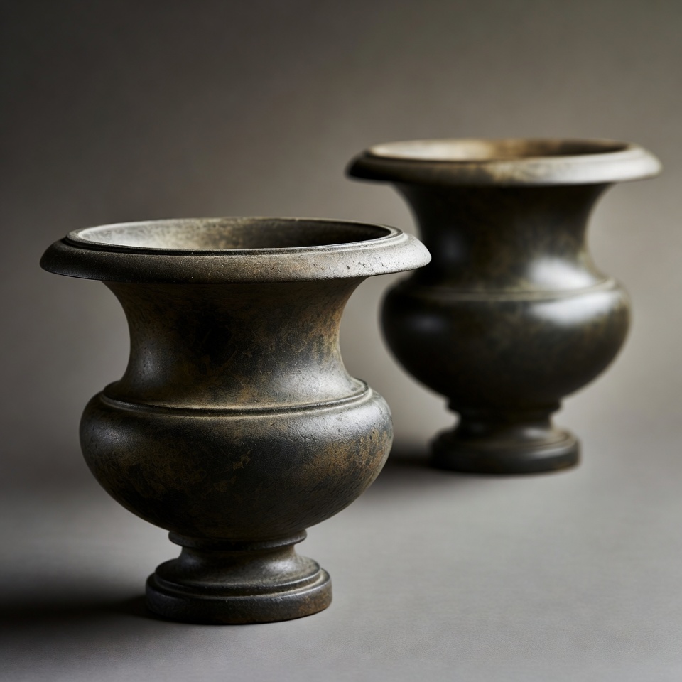 antique urns, bronze urns, classical urns, dark bronze, decorative urns, flared urns, garden urns, isolated background, object photography, pair urns, patina finish, pedestal urns, still life, vintage pottery, urns