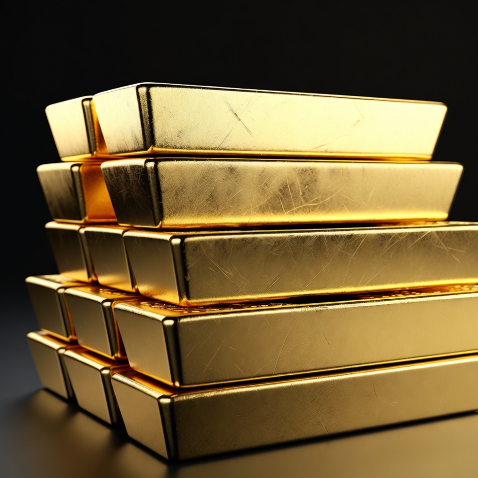 A tall stack of shiny gold bars sits on a dark background. The rectangular ingots gleam with metallic reflections and subtle scratches on their surfaces. The pile is neatly arranged with multiple layers visible.