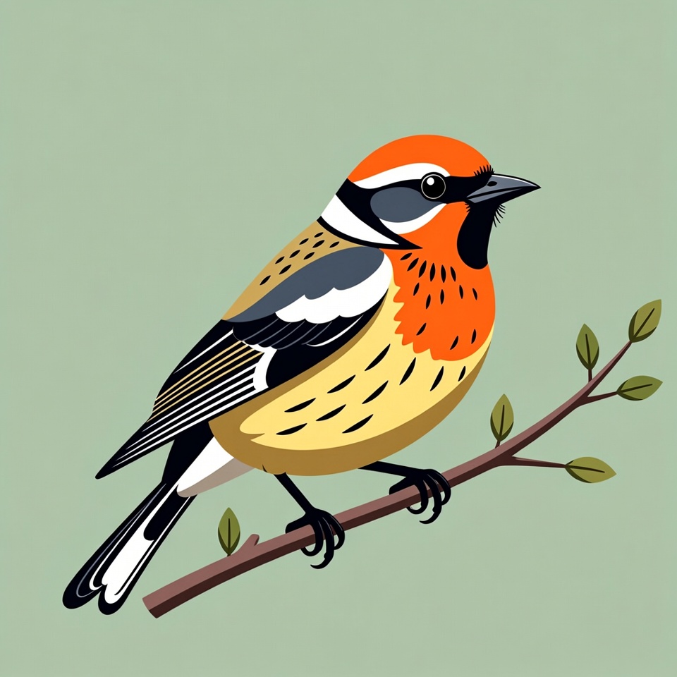avian, beak, bird on branch, black wings, clipart, colorful bird, feathers, finch, green branch, illustration, isolated background, leaves, perched bird, red head, red-headed finch, songbird, vector bird, white markings, wildlife art, yellow bird, bird
