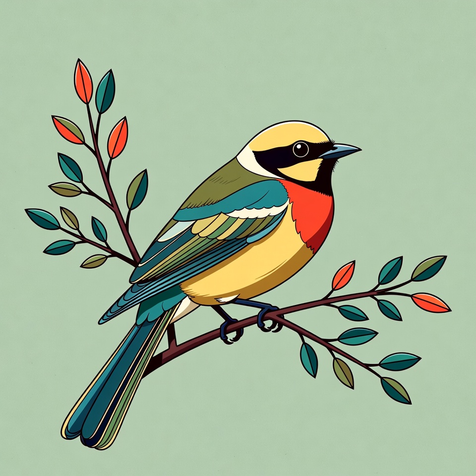 A vibrant illustration of a bird with yellow head, black eye mask, green back, blue wings, and red breast perches on a thin branch. Green and red leaves adorn the branch against a light green background. The bird faces left with detailed feathers and a sharp beak.