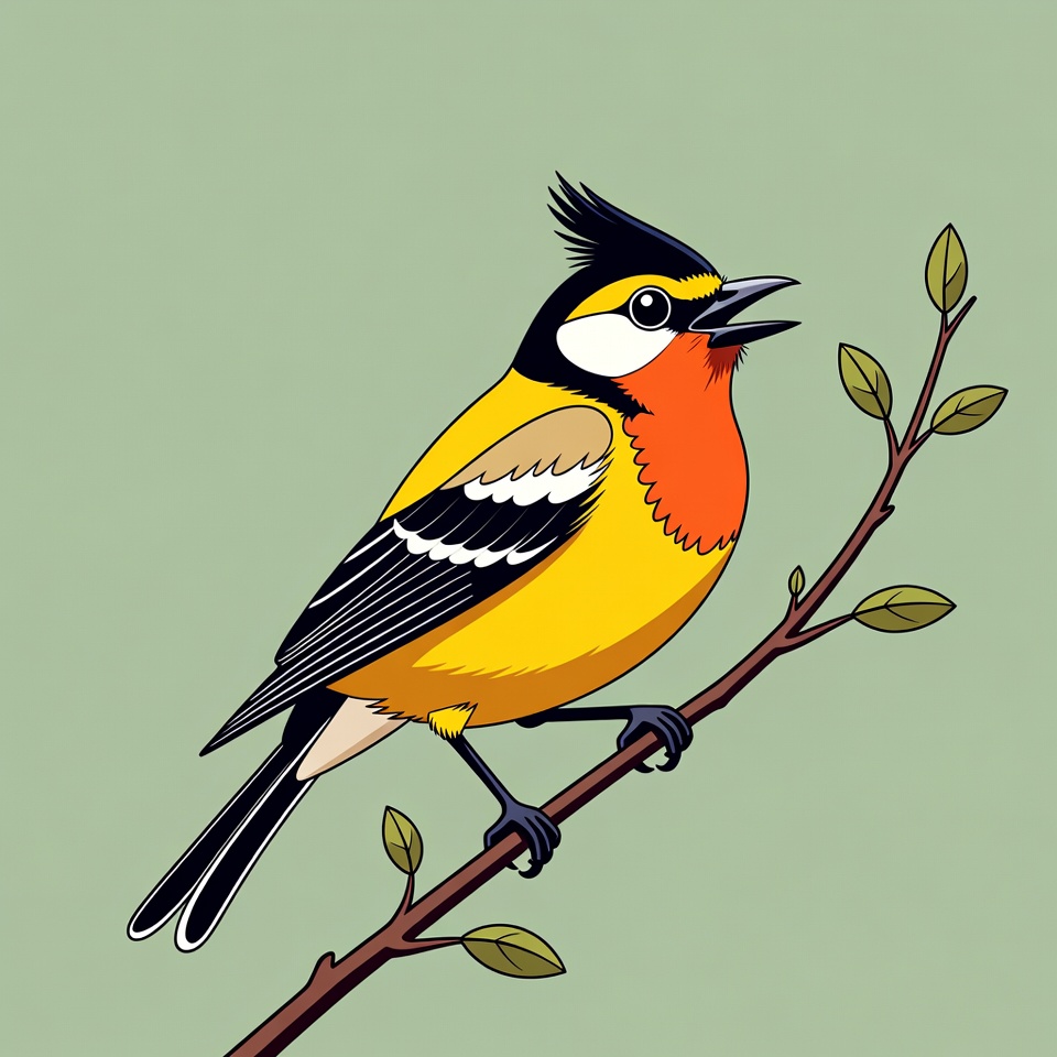 A vibrant cartoon bird with a black crest, yellow body, white cheek patch, black wings, and red throat perches on a thin green branch. It has large yellow eyes and an open orange beak. The illustration is set against a light green background.
