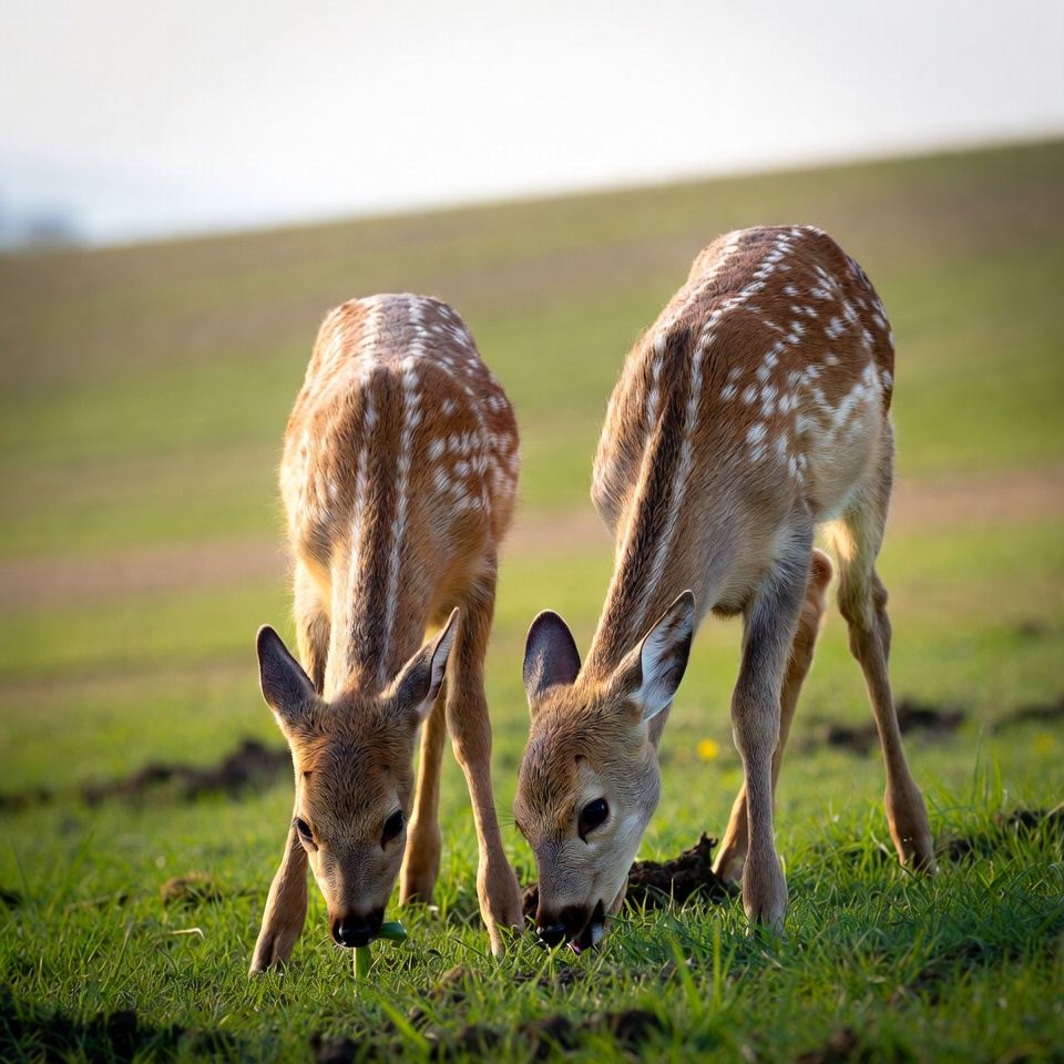 Two young spotted fawns with white spots on their reddish-brown fur are grazing on green grass in a field. They stand side by side, lowering their heads to nibble on the grass near the ground. The background features a gently sloping hill under a light sky.