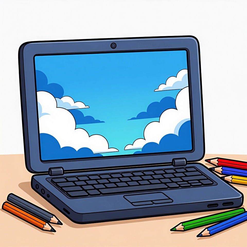 A cartoon illustration shows an open dark blue laptop on a wooden table with its screen displaying a bright blue sky and white clouds. Colorful crayons in red, yellow, green, blue, and other shades are scattered around the laptop. The image features a simple, isolated background.
