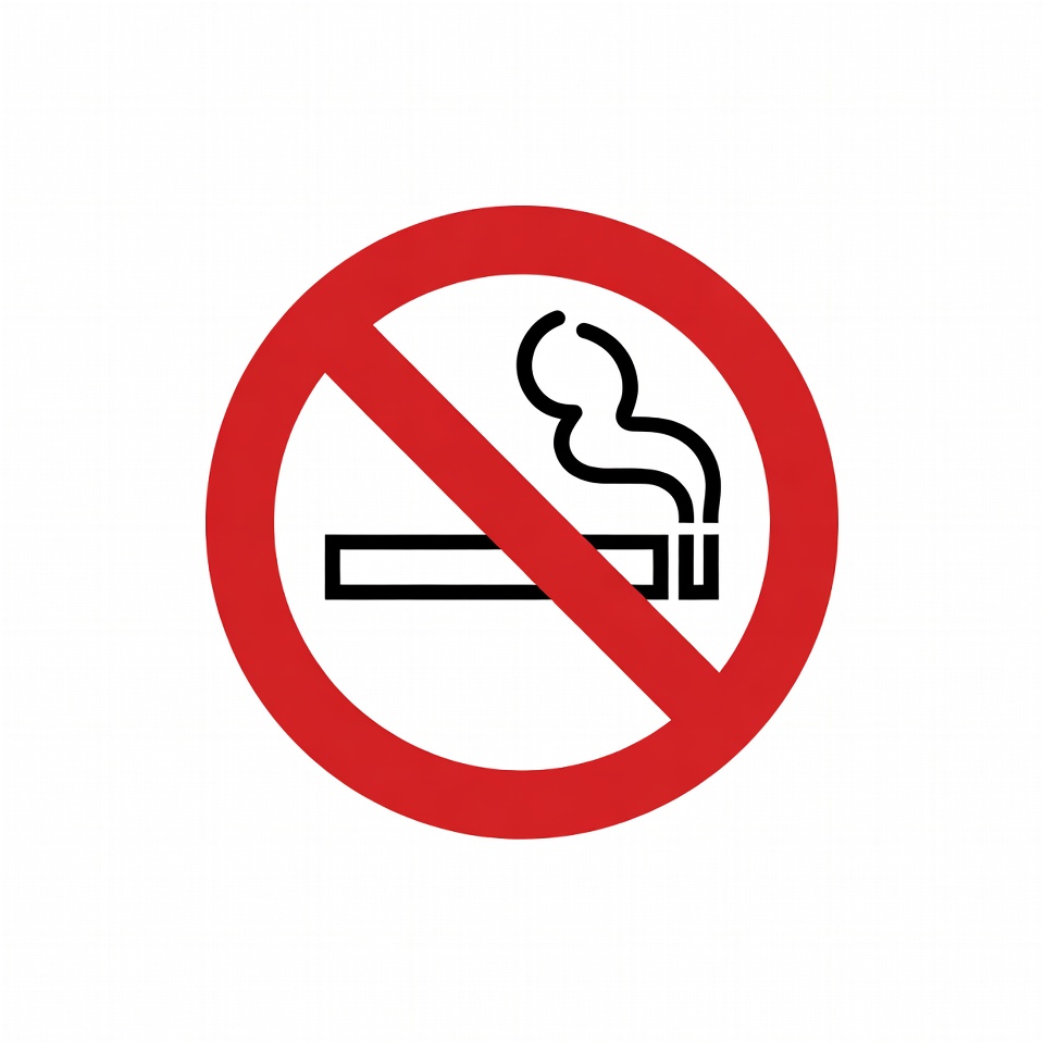 A red circular prohibition sign features a black silhouette of a cigarette with smoke trailing from it. A bold diagonal black slash crosses through the cigarette image. The icon is isolated on a white background.
