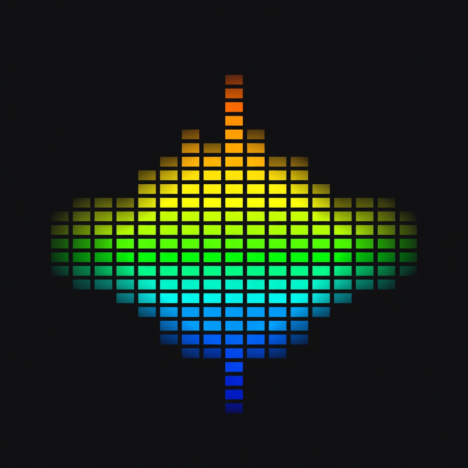 A vibrant equalizer display features vertical bars in a diamond shape against a black background. The bars transition through rainbow colors from orange and yellow at the top to blue at the bottom. Each bar is composed of stacked glowing pixels.
