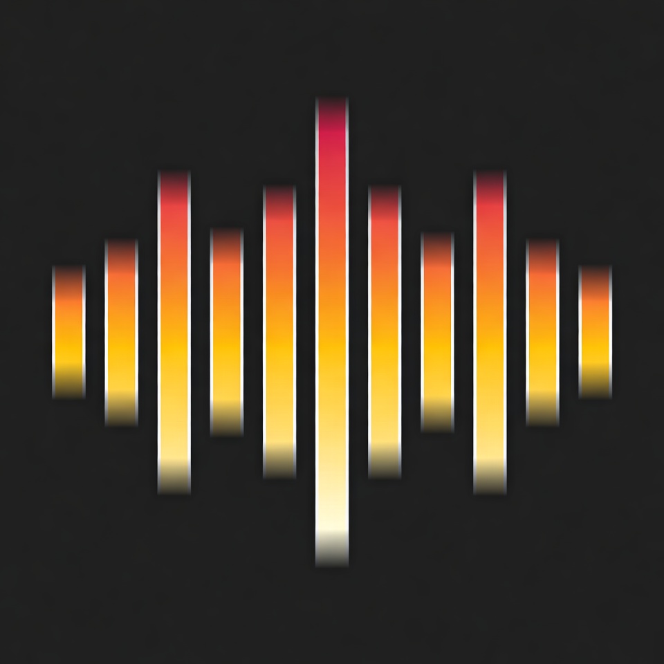 A vibrant equalizer visualization displays vertical bars in shades of orange, yellow, and red on a black background. The central bar peaks highest, creating a dynamic waveform pattern. The glowing effect gives it a neon, digital audio appearance.
