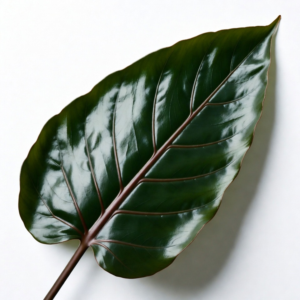 A large, glossy green leaf with prominent veins lies flat on a plain white background. The leaf features a heart-shaped form with deep green coloration and reddish-brown stems. It is isolated for clear visibility.