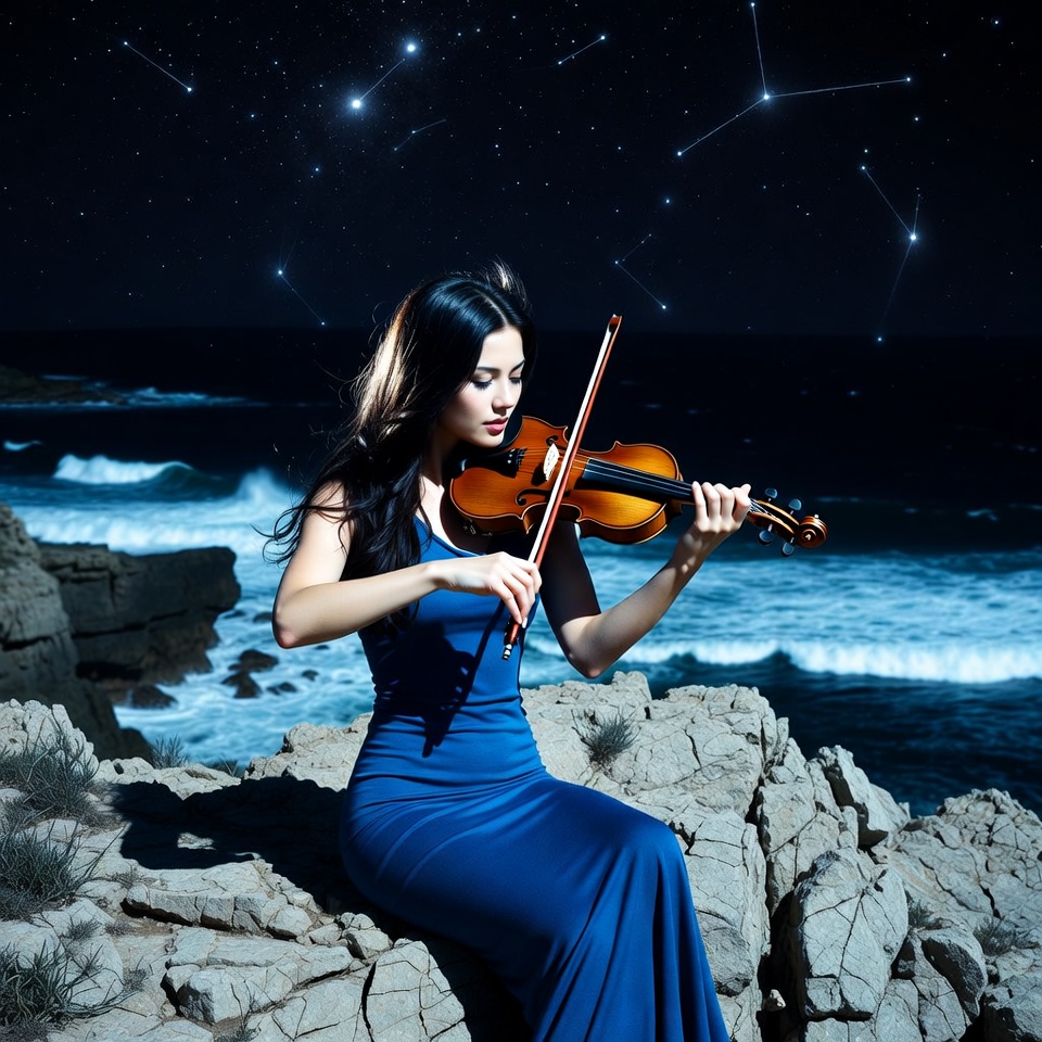 A young Asian woman with long dark hair sits on rocks by the ocean at night, playing a violin. She wears a form-fitting blue dress and gazes thoughtfully ahead. Stars and constellations shine in the dark sky above crashing waves.
