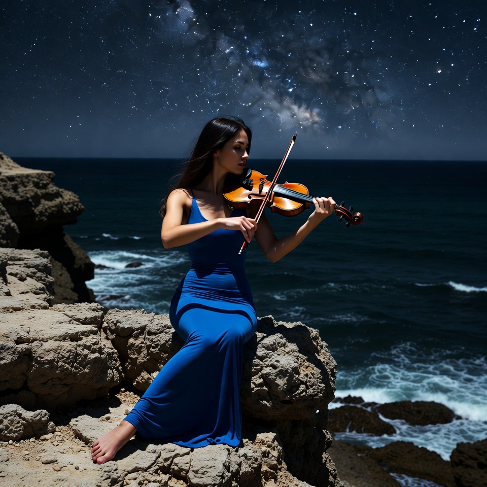 A young Asian woman with long dark hair sits barefoot on rocky cliffs by the ocean, playing a violin under a starry night sky with the Milky Way visible. She wears a sleeveless blue dress that flows elegantly. Waves crash against the rocks below in the dark seascape.