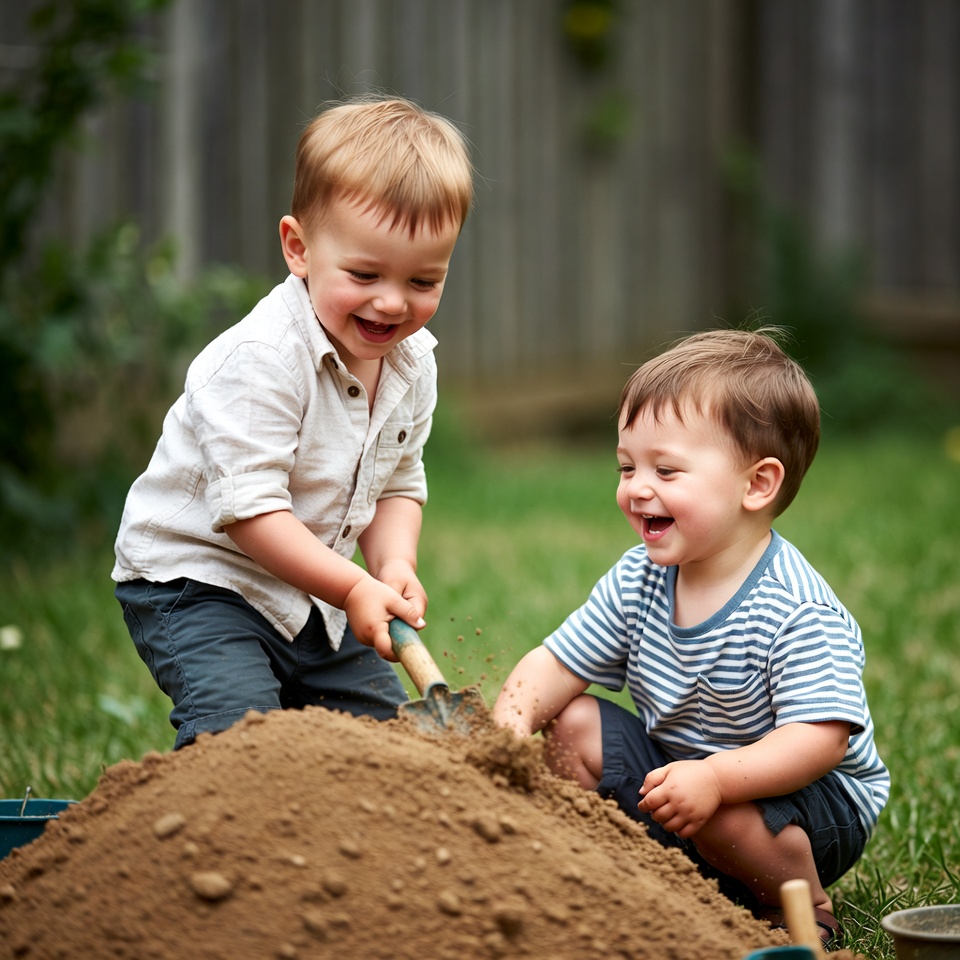 Two young boys with blonde hair are happily digging and playing with sand using shovels in a grassy backyard. One boy wears a light shirt and pants while kneeling, and the other in a striped shirt and shorts sits beside him. A wooden fence and green grass form the background.