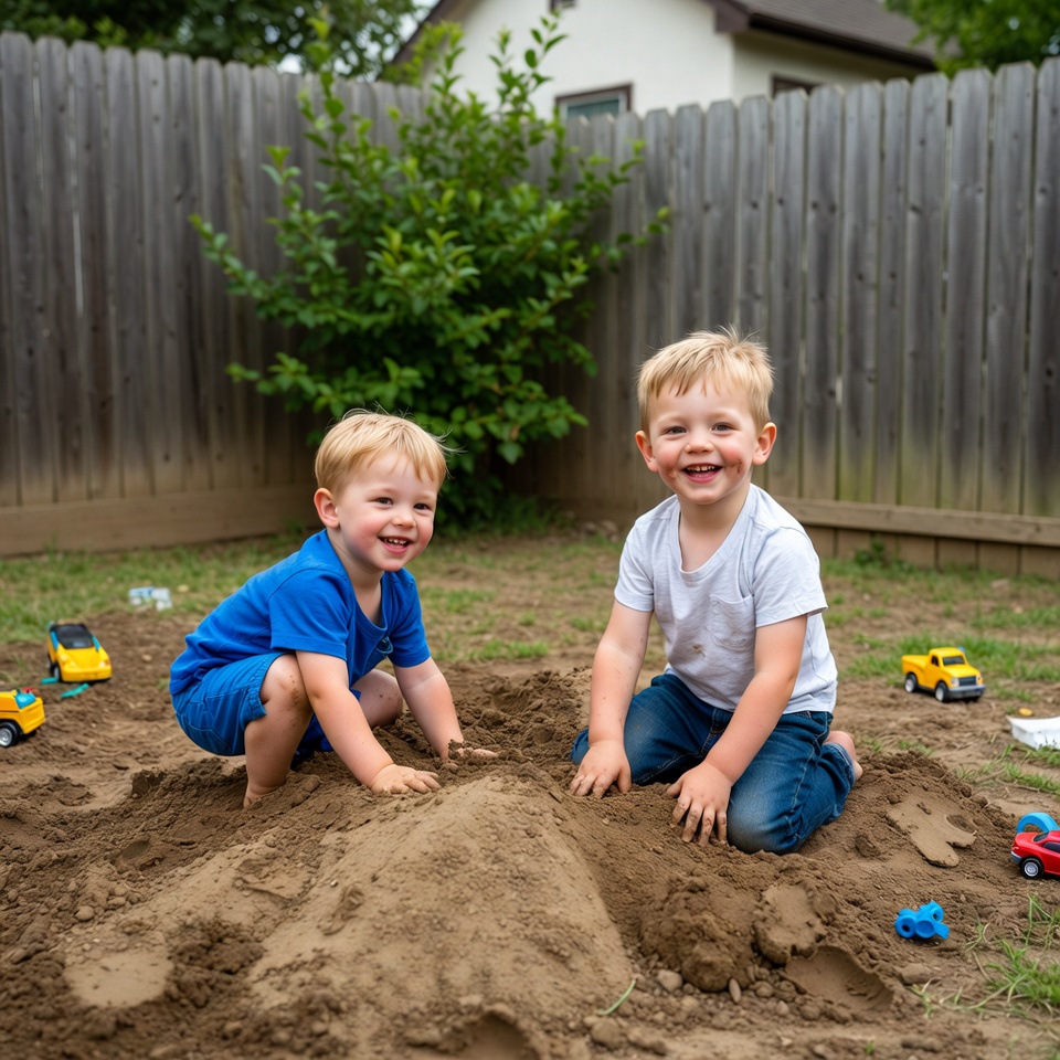 Two boys playing in backyard sand pile