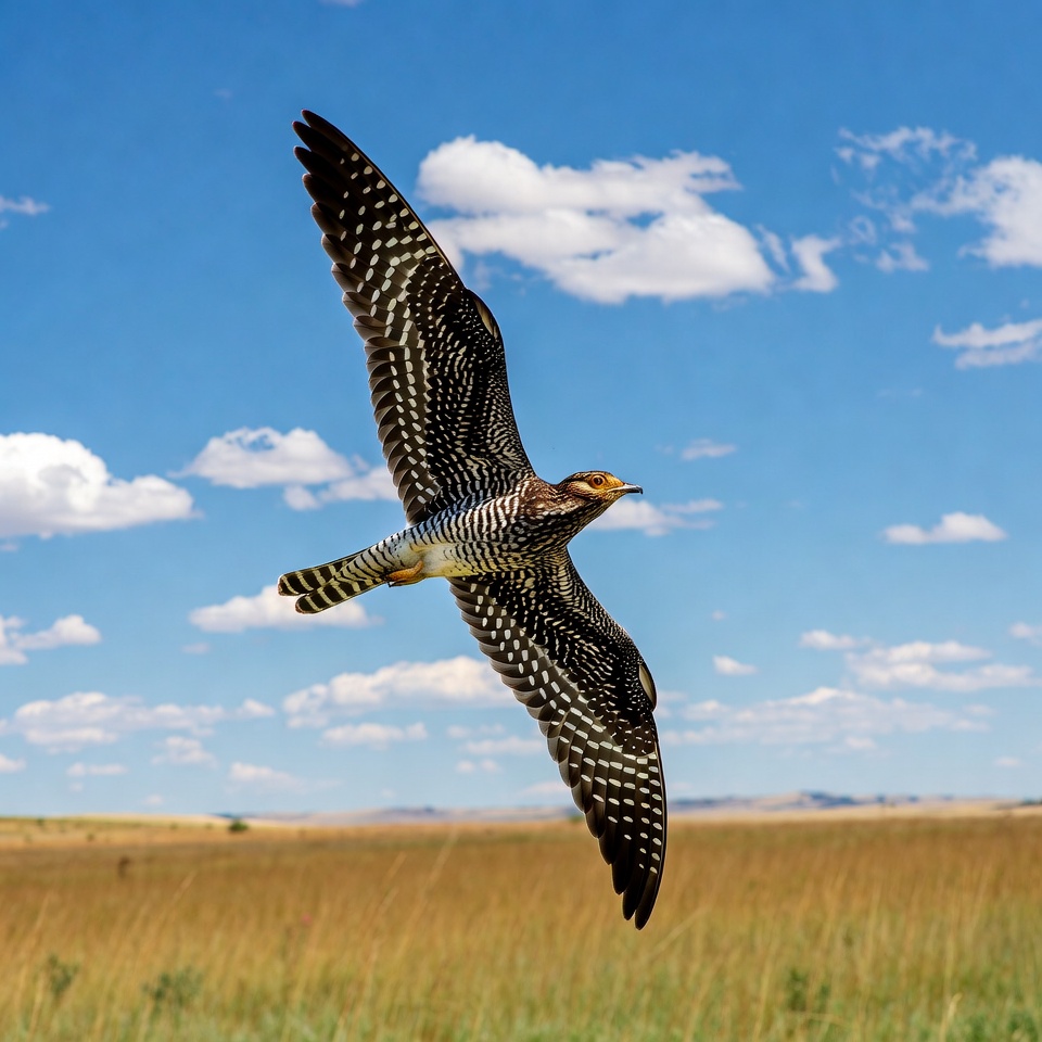 A barred buttonquail soars through a clear blue sky with scattered white clouds. Its wings are spread wide, displaying intricate spotted and barred feather patterns in black, white, brown, and yellow. Below, golden grasslands stretch to the horizon under the bright sunlight.