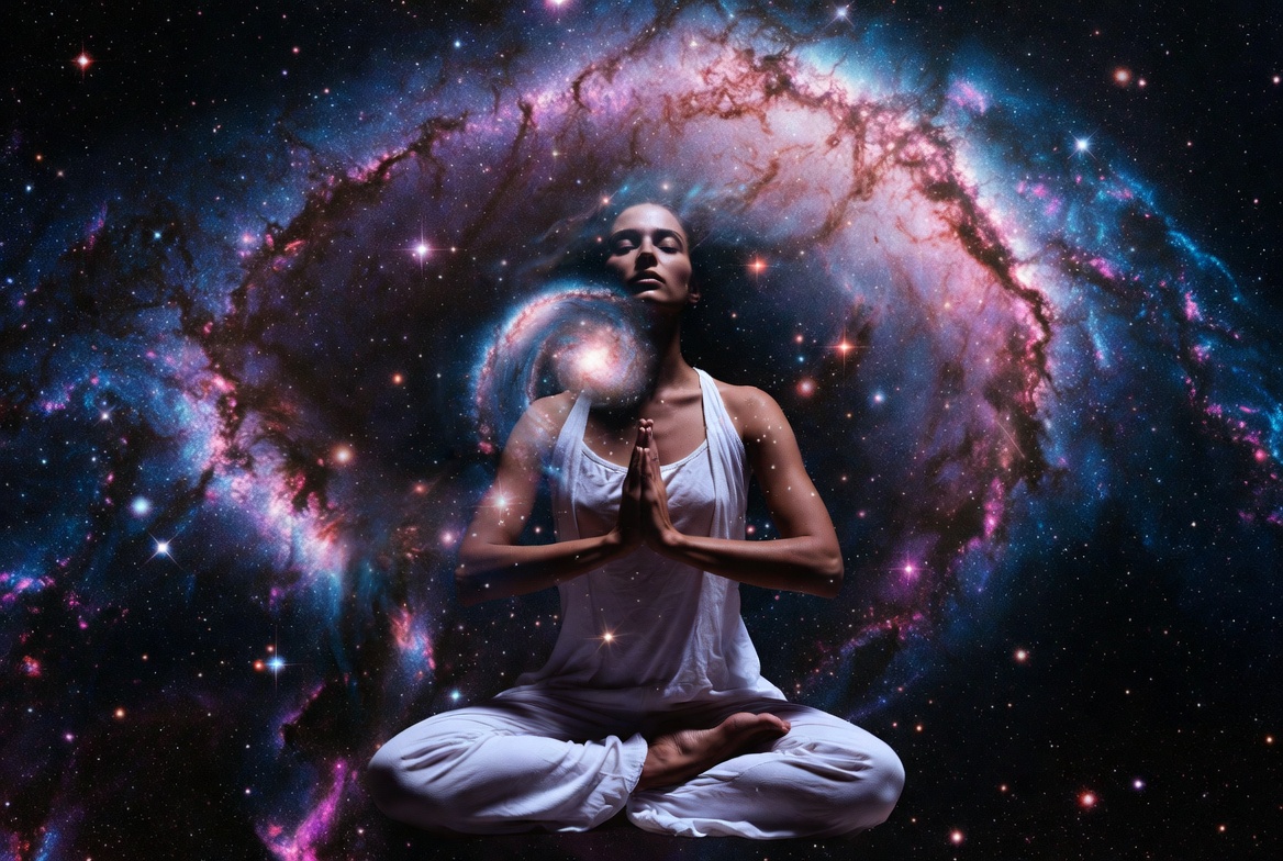 A woman with long dark hair sits in lotus position with hands in prayer pose, centered within a vibrant swirling nebula of purple, pink, and blue cosmic gases. She wears a loose white tank top and pants, surrounded by stars and ethereal space energy. Her eyes are closed in serene meditation against the infinite galaxy background.