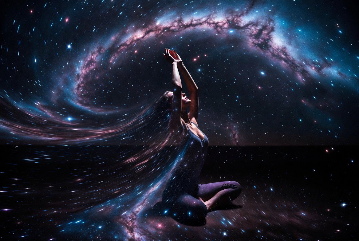 A woman with long flowing hair sits in a yoga lotus pose with arms raised, surrounded by swirling galaxies and stars. Her hair and clothing blend into vibrant purple and blue nebulae against a dark starry space background. The digital artwork creates a mystical fusion of human form and universe.