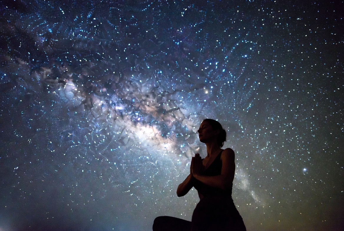 Milky Way, White, astronomy, bun hair, cosmic background, crossed legs, dark sky, female, galaxy, meditation, night sky, praying hands, profile view, silhouette, space, stargazing, starry sky, stars, yoga pose, woman