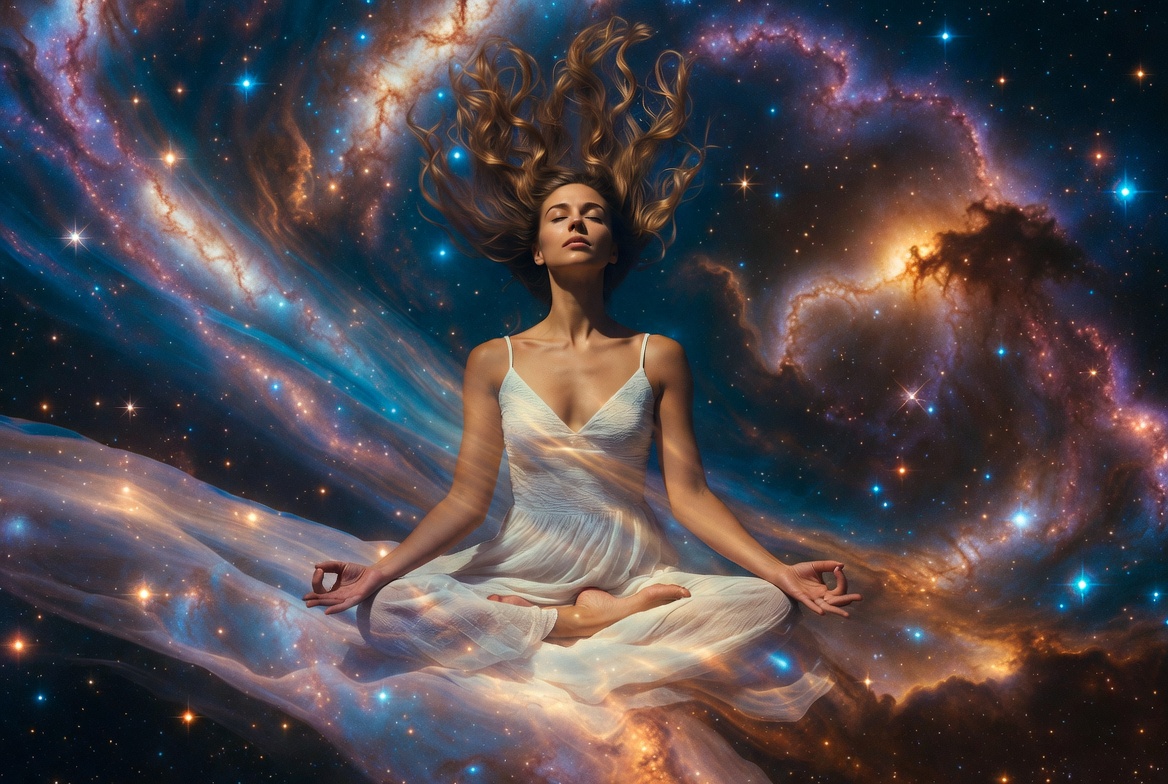 A woman with long wavy hair sits in lotus pose wearing a flowing white dress amid swirling nebulae and stars. Her eyes are closed in meditation, surrounded by vibrant blues, purples, and oranges of space galaxies. Ethereal light and cosmic energy envelop her figure.