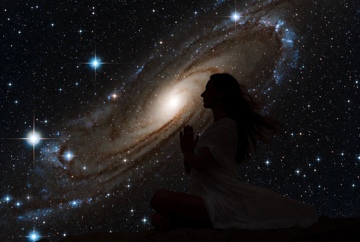 A silhouette of a woman with long hair kneels in prayer with hands clasped, set against a vibrant spiral galaxy in a starry night sky. She wears a flowing white dress and sits on the ground. The image blends cosmic elements with a meditative human figure.