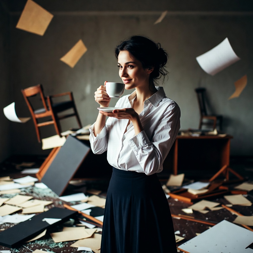 A woman with dark hair in a bun holds a white teacup to her lips while standing in a chaotic office. Papers are flying and scattered everywhere around her, with an overturned chair and desk in the messy room. She wears a white blouse and black skirt.