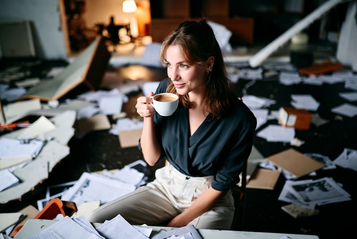 Woman drinking coffee amid scattered papers