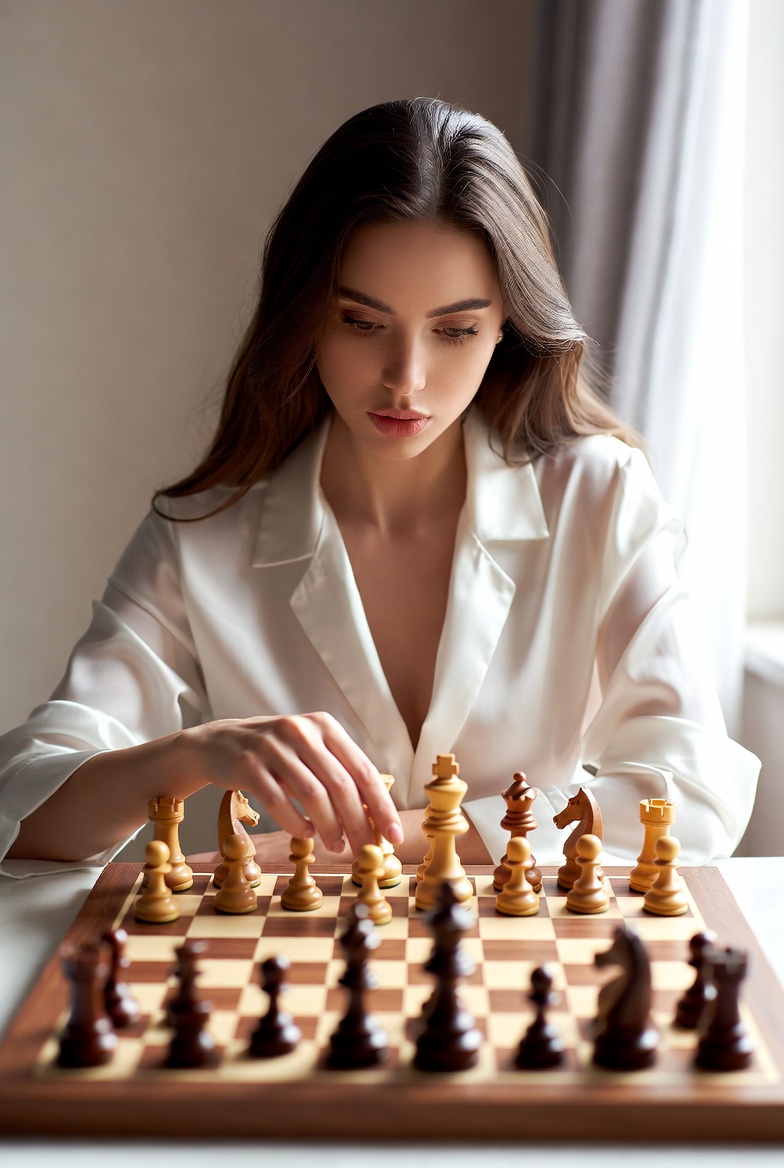 A young woman with long brown hair concentrates on a chessboard, wearing a white satin blouse. She moves a chess piece with her hand while seated at a wooden table near a window with sheer curtains. The chess set features black and white pieces on a checkered board.
