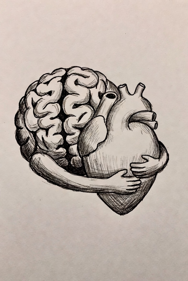 anatomical heart, anatomy, arms, black ink, clipart, drawing, embrace, emotion, heart, hugging, human brain, illustration, ink sketch, isolated background, line art, love, mind, organs, symbolic, brain