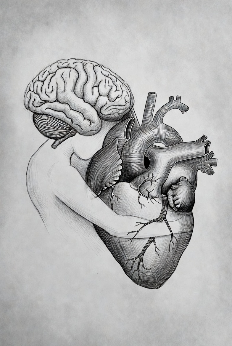 A detailed pencil sketch depicts a nude female figure embracing a large human brain on her left side and a detailed anatomical heart on her right. The artwork features intricate shading and line work on a light gray background. Both organs are proportionally large and integrated into the composition.