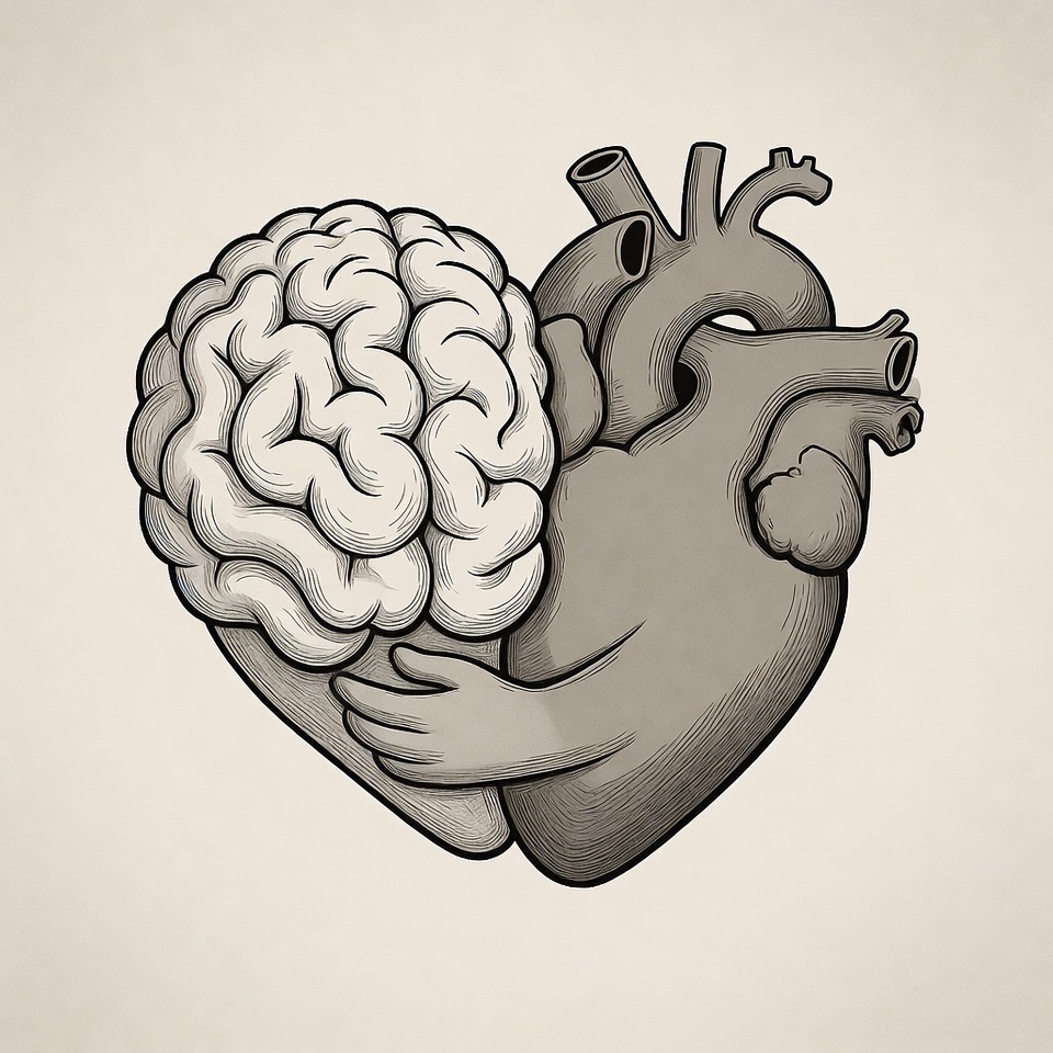 A detailed line art illustration shows a large brain hugging a human heart. The brain wraps its arms around the heart in an affectionate embrace. Both organs are rendered in grayscale on an isolated white background.