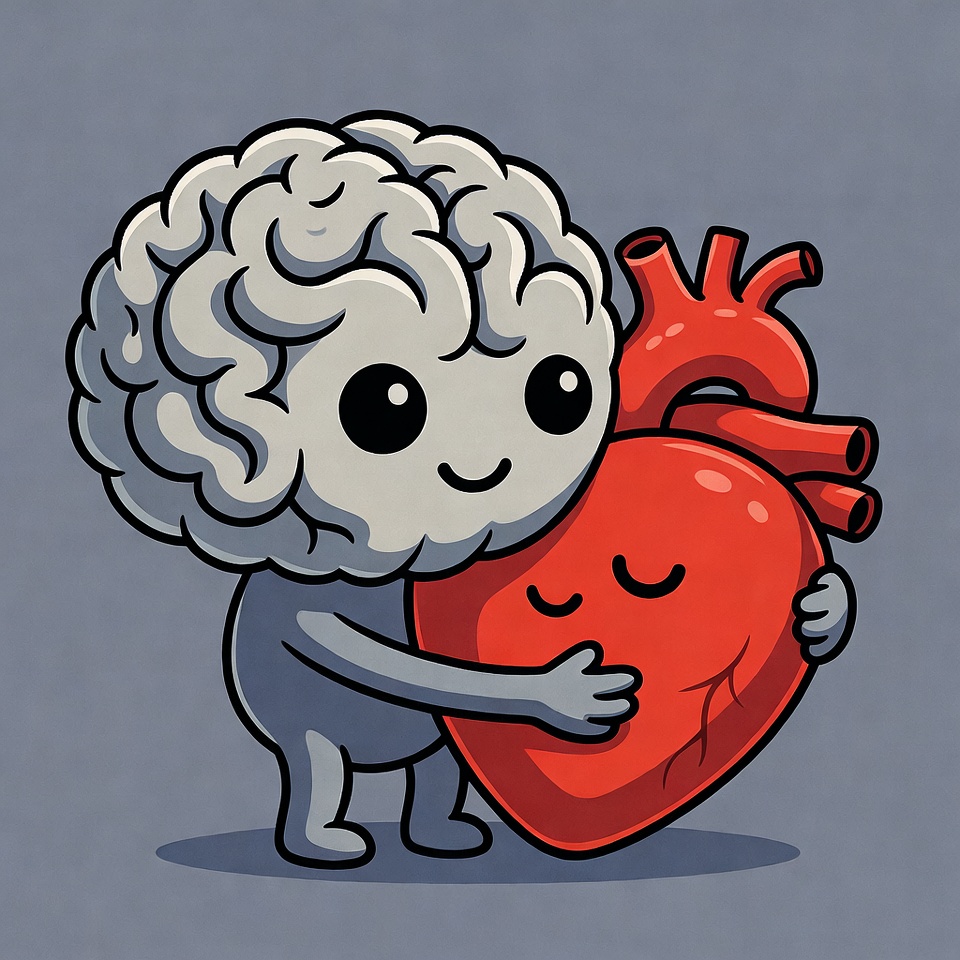 A cute cartoon brain with big eyes hugs a red heart tightly. The brain has a gray body and white brain folds, while the heart features visible arteries and veins. Both characters have happy expressions on a plain background.