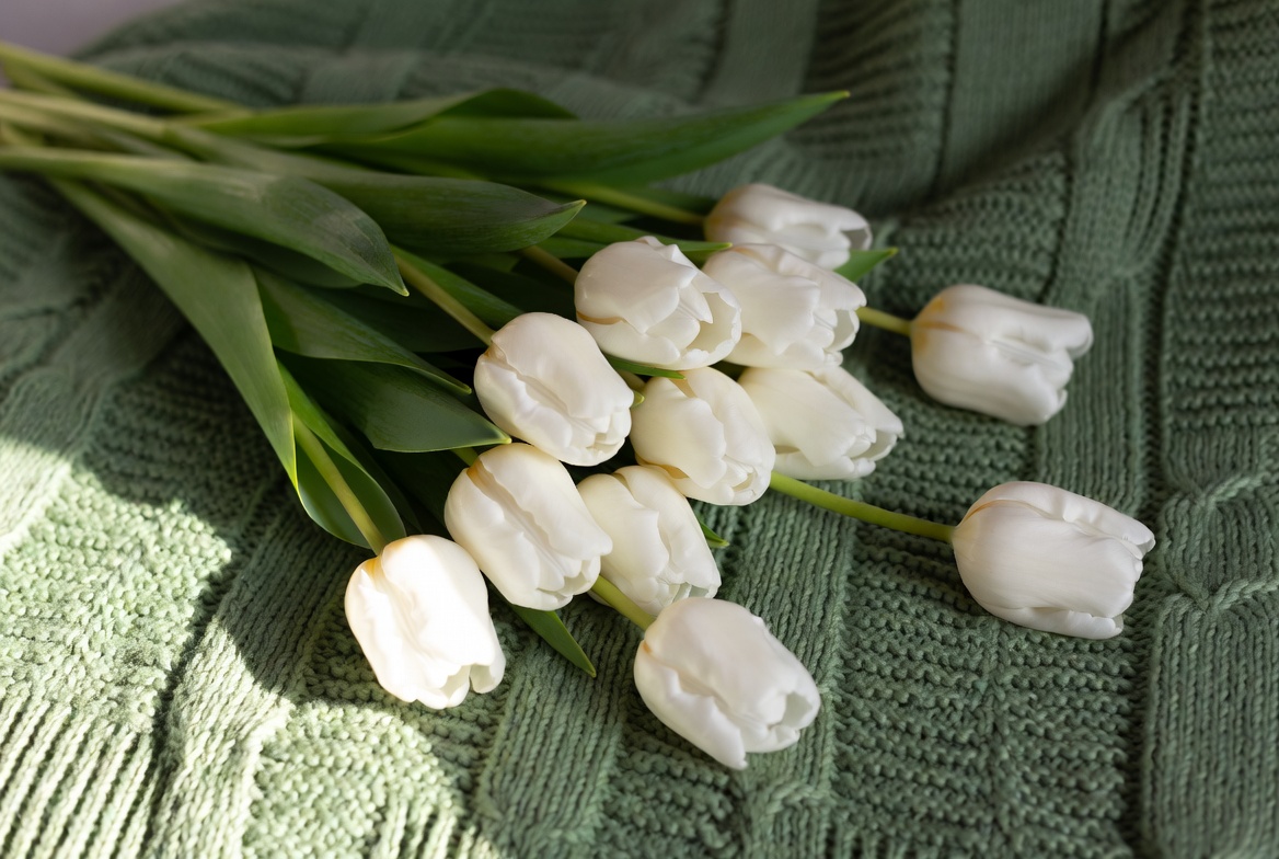 blooms, bouquet, floral arrangement, flower bunch, flowers, fresh flowers, green blanket, green stems, isolated background, knit fabric, nature, petals, plant, spring flowers, tulips, white flowers, white tulips