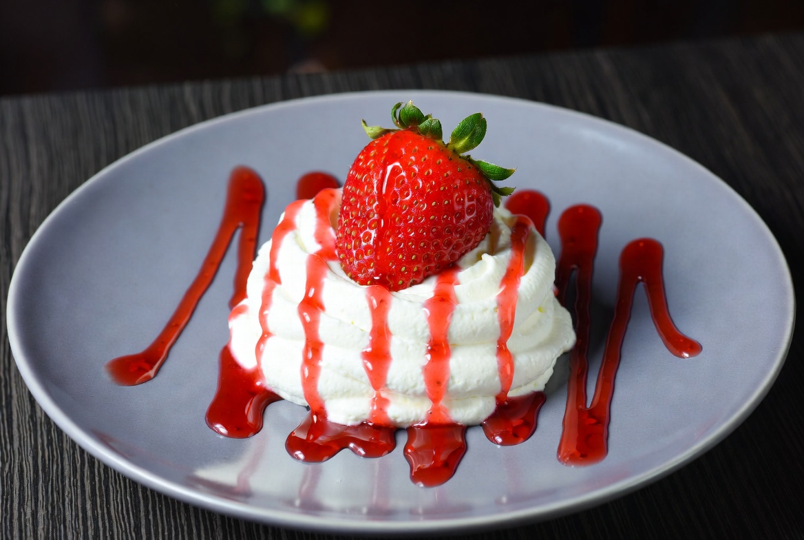 cream swirl, dessert, food photography, fresh fruit, fruit dessert, gourmet dessert, gray plate, pastry, plate, red sauce, strawberry sauce, strawberry topping, sweet treat, whipped cream, strawberry