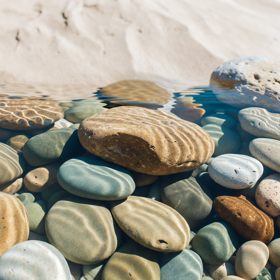 Smooth pebbles in various colors including green, brown, white, and gray lie submerged under shallow, crystal-clear water at the beach. White sand forms the background above the water line, with gentle ripples distorting the view of the stones below. Sunlight filters through the water, highlighting the textures and patterns on the rocks.