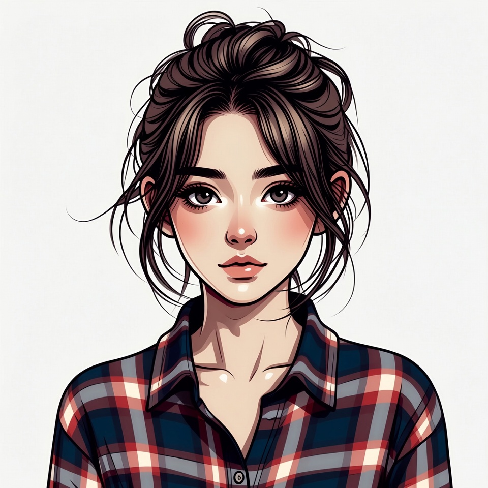 Asian, beautiful, brown hair, collared shirt, cute, digital art, face, female, headshot, illustration, isolated background, large eyes, messy bun, plaid shirt, plump lips, portrait, updo hairstyle, young woman, anime girl