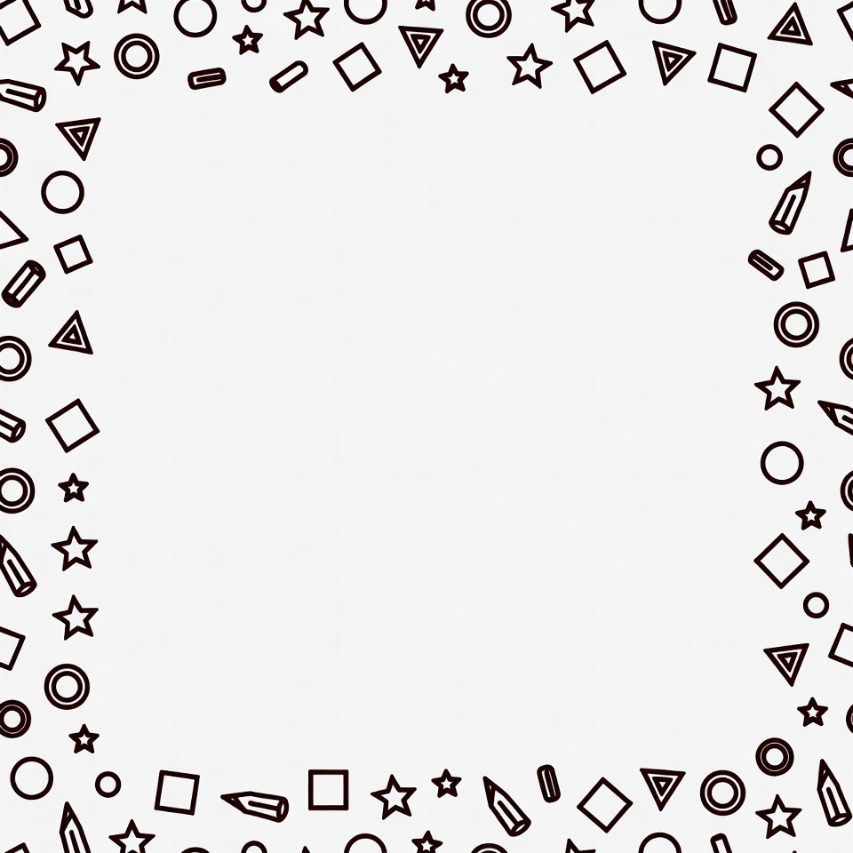 A simple line art border features various geometric shapes including circles, triangles, squares, stars, and pencil icons. The shapes are arranged along the edges of a blank white square frame. The design uses black outlines on a transparent background.