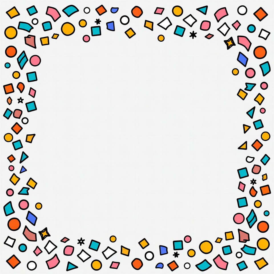 A vibrant border frame made of assorted geometric shapes surrounds a large empty white space. The shapes include triangles, circles, stars, and squares in bright colors like red, blue, yellow, pink, and orange. The design is isolated on a white background with no central content.