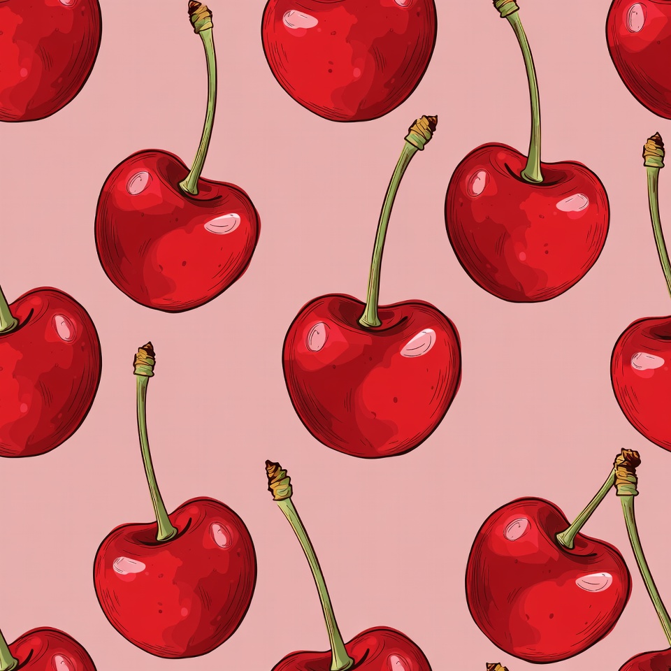 berry pattern, cherry illustration, cherry pattern, cherry wallpaper, clipart, fruit illustration, fruit pattern, glossy cherries, green stems, hand drawn cherries, illustration, isolated background, pink background, red cherries, ripe cherries, seamless pattern, summer fruit, vector cherries, cherries