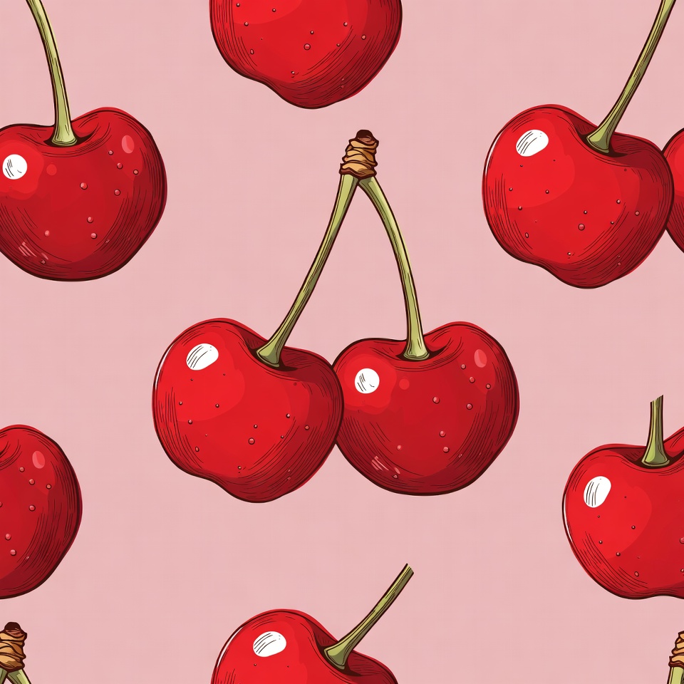 A seamless pattern illustration features multiple red cherries with green stems on a pink background. The cherries are depicted in various orientations, some singly and some paired together. The hand-drawn style includes detailed shading and highlights on the fruit.