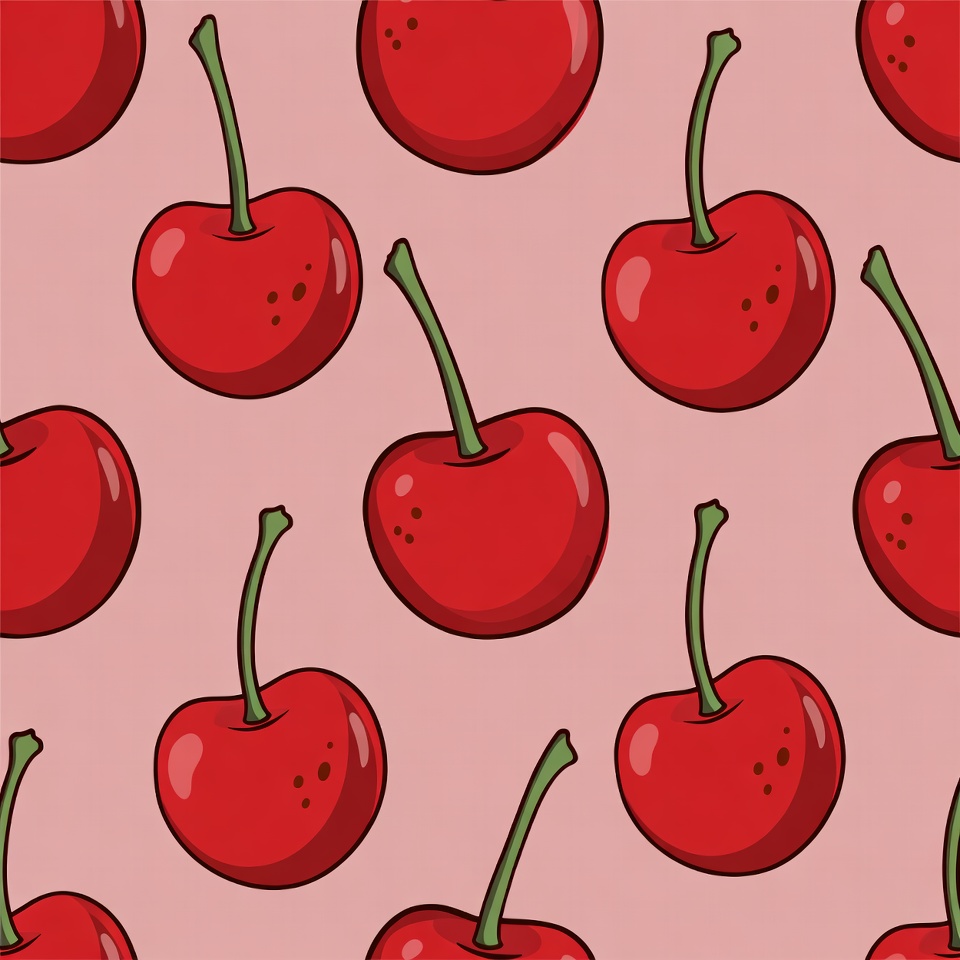 A seamless illustration features multiple red cherries with green stems arranged in a repeating pattern. Each cherry is shiny and round with small highlights. The soft pink background complements the vibrant red fruits.