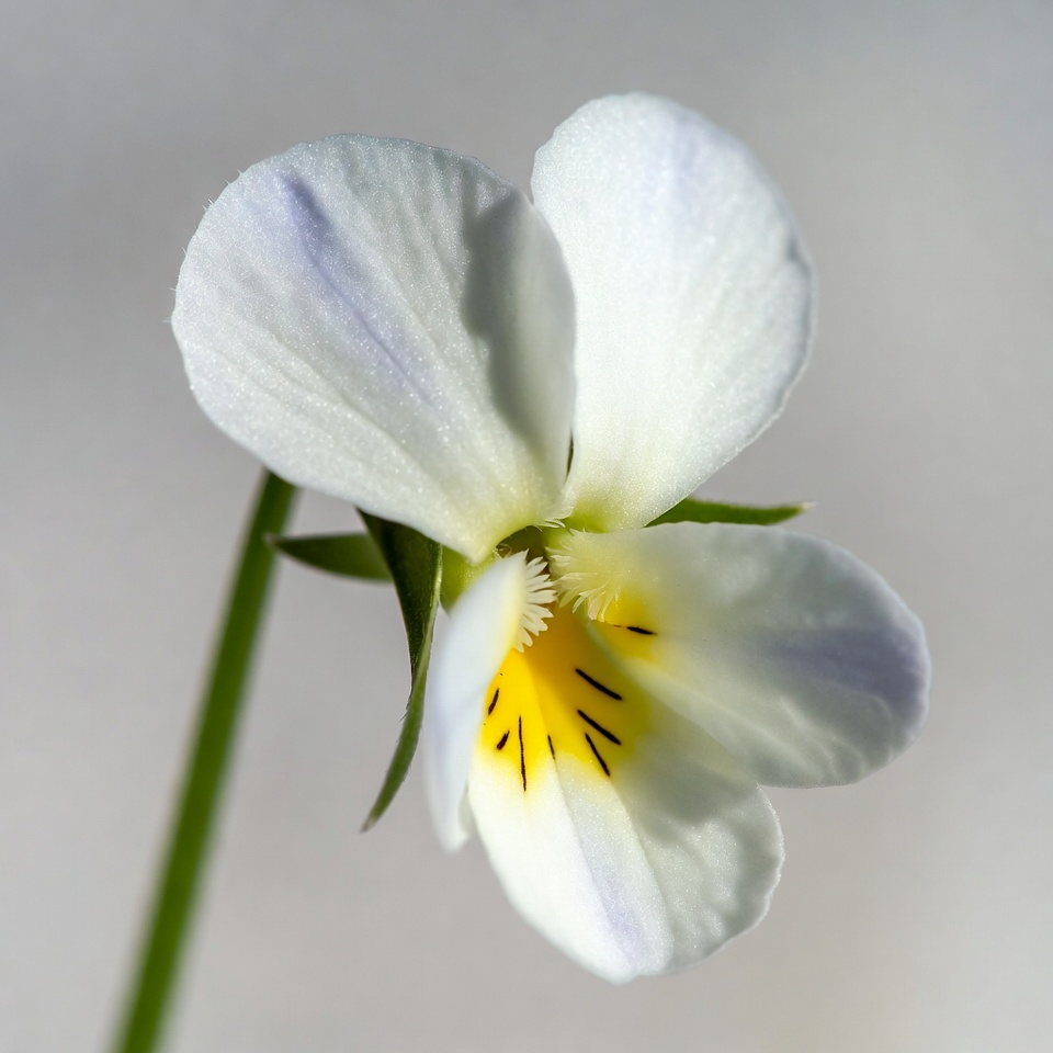 blossom, botany, floral, flower closeup, green stem, isolated background, macro photography, nature, petals, purple veins, sepals, viola, white flower, wildflower, yellow center, violet flower