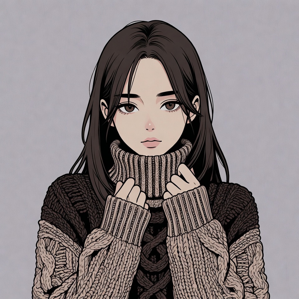 Asian, cable knit, close-up, cozy sweater, cute girl, dark hair, female, gray background, hands on collar, illustration, knitted sweater, long hair, manga style, portrait, soft lighting, stylish outfit, turtleneck sweater, winter fashion, woman, young woman, anime girl