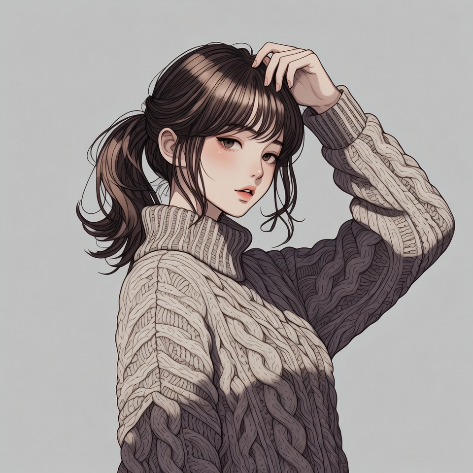 Asian, anime style, brown hair, cute girl, detailed eyes, digital art, fashionable, female, gray sweater, hand on hair, head tilt, illustration, isolated background, knitwear, ponytail, portrait, realistic shading, side profile, soft expression, stylish outfit, sweater, winter fashion, woman, young woman, anime girl