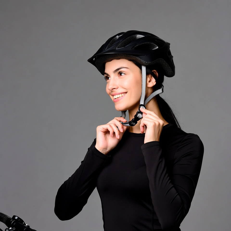A woman with dark hair in a ponytail smiles while adjusting her black bike helmet. She wears a long-sleeved black top and stands against a gray background with a bicycle nearby. Her hands are positioned on the helmet straps.