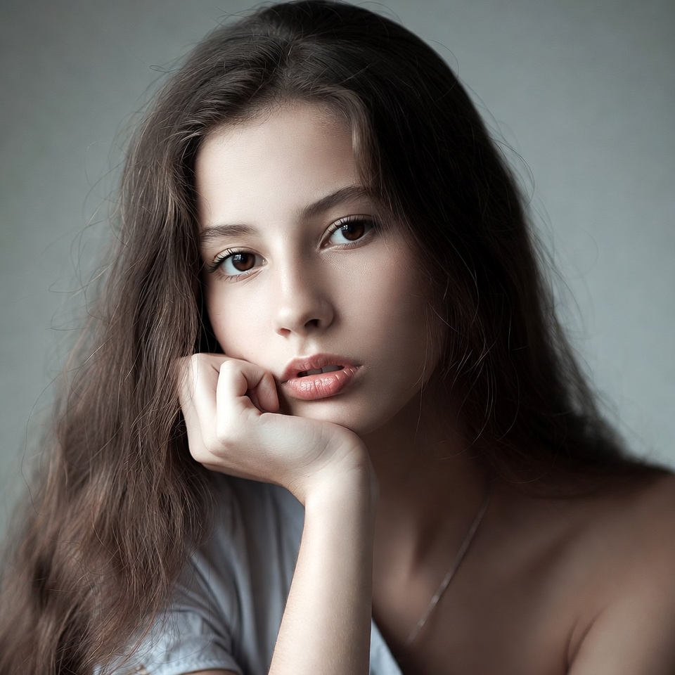 A young woman with long wavy brown hair rests her chin on her hand against a plain gray background. She has a thoughtful expression with subtle makeup on her lips and eyes, wearing a loose white off-shoulder top and a delicate necklace. Her face is softly lit, highlighting her features.