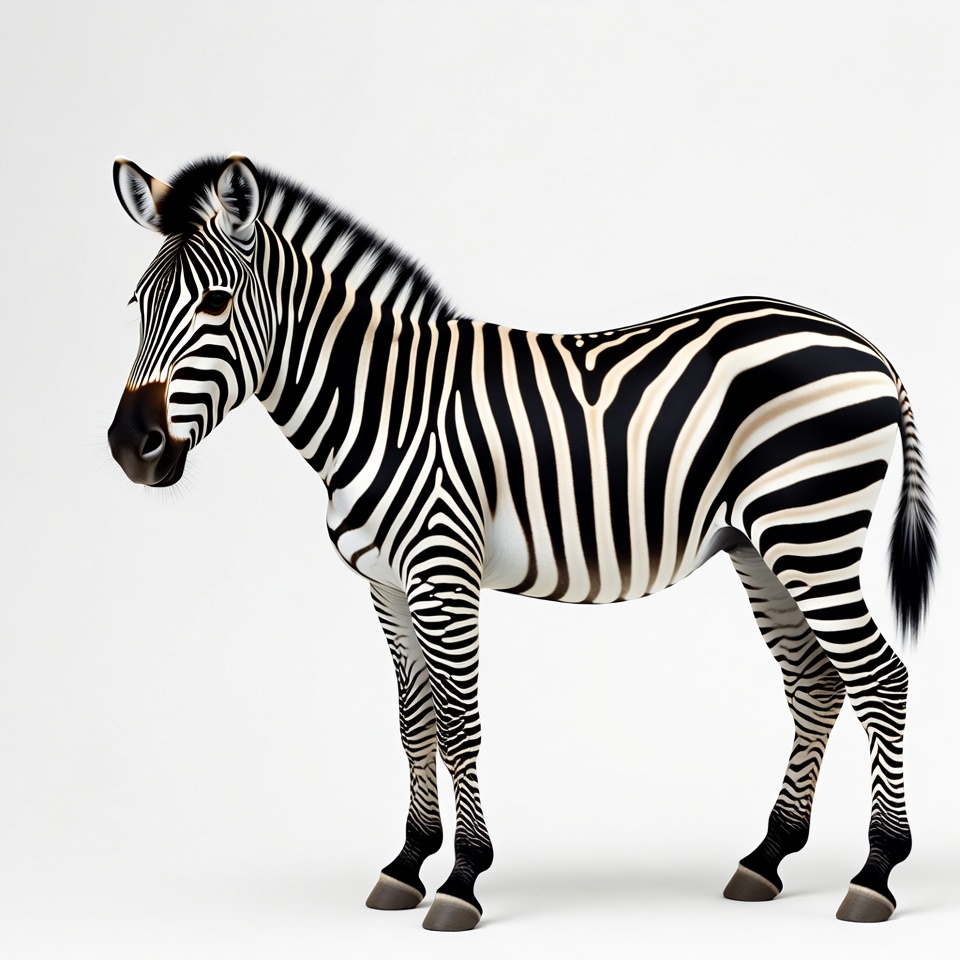 A zebra with black and white stripes stands facing left on a plain white background. It has a short mane, pointed ears, and a bushy tail. The illustration is detailed with smooth shading on the stripes.